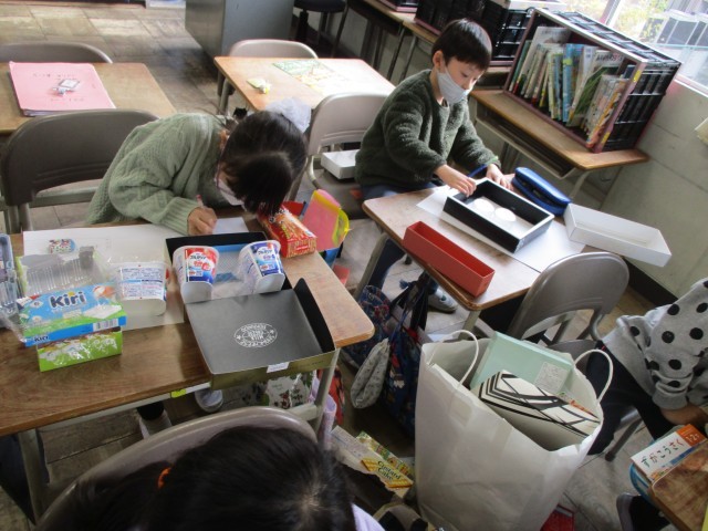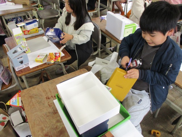 自分の小さな友達が喜ぶお家を考えています。お家の中になにがあったら嬉しいのかをクラスでたくさん出したあと、実際に箱を並べて家の形を考えました。そのあと設計図をかきながら、どんな部屋があったらいいかを考えました。