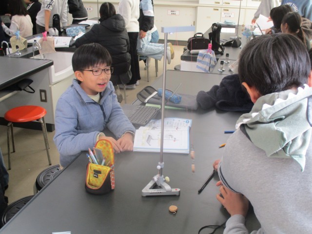 授業では、理科の「ふりこのきまり」の学習が進んでいます。ふれはばやおもりの重さ、ふりこの長さを変えながら、1往復にかかる時間を調べる実験に取り組みました。自分たちの予想と結果を比べながら、考え方を深めている様子が印象的でした。
