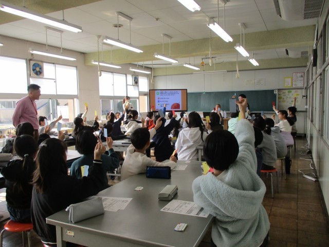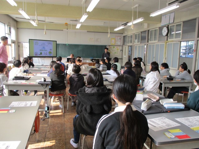 トヨタ未来スクールの皆様をお招きして、車と環境、経済について考える学習を行っていただきました。はじめに環境や車づくりについてのクイズを行いました。今まで学習をしてきたことを振り返ると同時に、自分たちの生活にどのような影響が出るのか考えることができました。また、車会社の経営者になり、車と環境、経済のかかわりを考えるゲームにも取り組みました。会社経営者として売り上げの利益を優先させるだけではなく、環境や生活にも配慮した経営をしていくことの難しさを感じることができました。