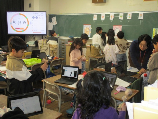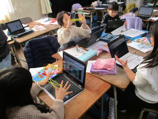 1年生の教室では、生活科の学習で昔遊びを行っていました。あやとり、こま回し、福笑い、だるま落とし、けんだま、ヨーヨーなど、それぞれの遊びを楽しんでいました。「こまのひもを上手に巻けるようになったよ」と教えてくれたり、体をリズムよく動かしてヨーヨーに興じたりと、自分の思うようにおもちゃが動かせるよう五感を使って楽しんでいました。体全体を使って楽しんだ時間は、体と心に深く残ります。そして、自分なりに工夫して得た喜びは、また次の挑戦につながります。こらからも友達と一緒に昔遊びを楽しんでほしいと思います。