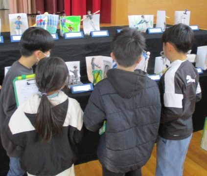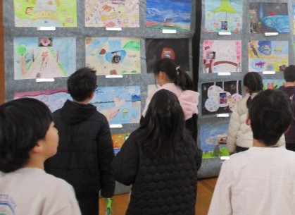 今日は学習発表会で展示されている作品を鑑賞しました。「これ見て、きれいだよ。」「すごいね」「迫力があって上手!」などと他学年の頑張りを称賛したり、自分たちの作品の仕上がりに改めて満足すしたりする姿も見られました。どの作品にもこだわりがあり、学年に関係なく魅入ってしまいましたね。