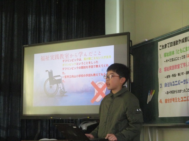 今日の学習発表会では、総合的な学習で1年間学んできた、福祉、ユニバーサルデザインについて一人一人発表をしました。子どもたちは「緊張する」、「心臓がはちきれそう」と言いながらも、一生懸命発表をしていました。また一つ成長した姿を保護者の皆様に見せることができたのではないかと思います。残りの5年生での生活でも、またさらに成長できるとよいですね。