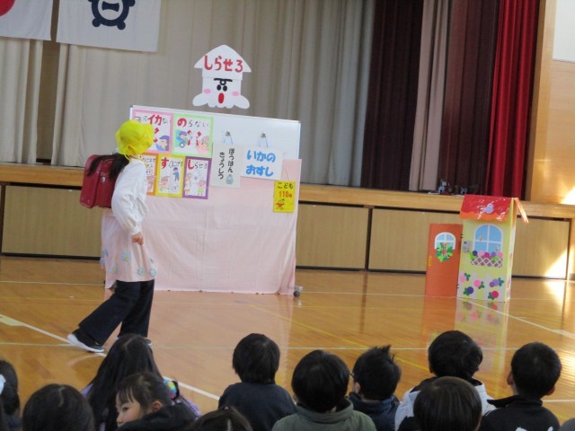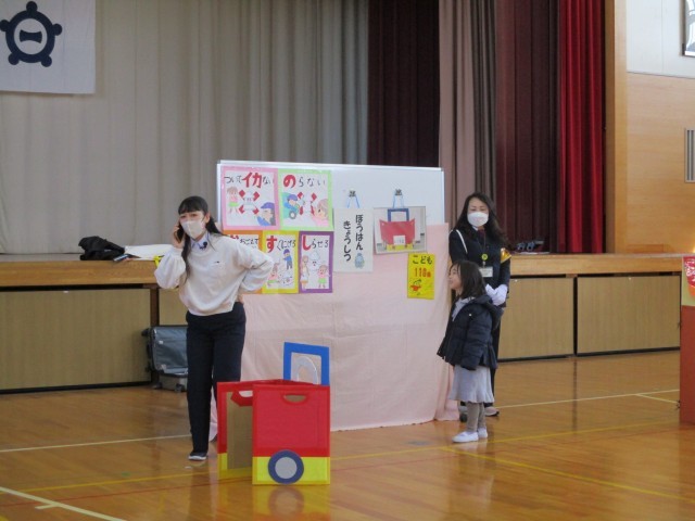 防犯教室で自分の身を守るための大切なお話を聞きました。「いかのおすし」の大切さや安全に留守番をするための約束を教えてもらいました。おうちでも防犯について話題に出していただけるとありがたいです。