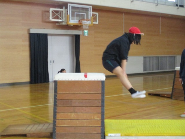 開脚飛びの練習をしました。これまでの自己ベストと比較して、跳べる段数が高くなったり、跳ぶフォームが美しくなったりしました。強い踏切、指先まで力を入れた着手、跳び箱を押し込むなどのポイントに気を付け、取り組むことができました。