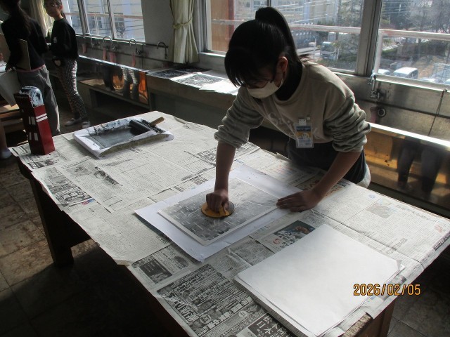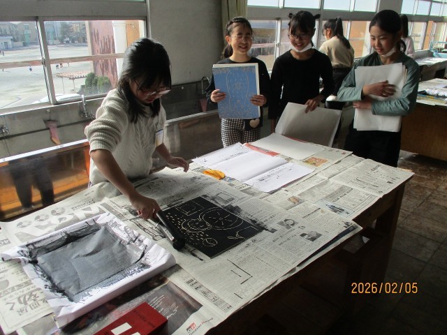 表現したいことに合わせて彫刻刀の種類を選んだり、インクをつけて刷ったときの白色と黒色のバランスなどを考えたりして、工夫して取り組んでいます。