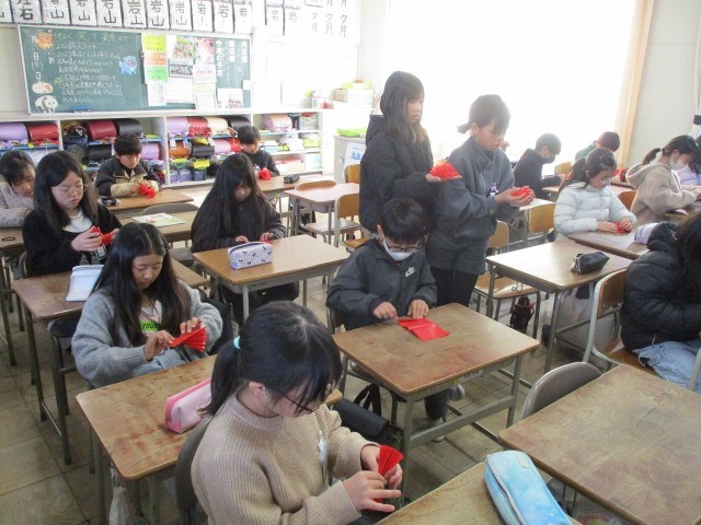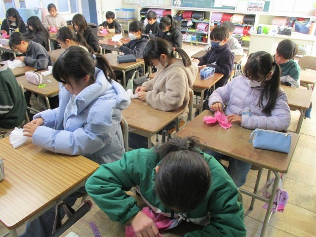 入学式などで使う花飾りを作りました。大切な式で使うことを考えてとても丁寧に作っていました。