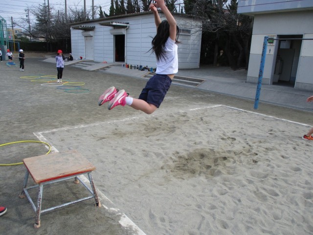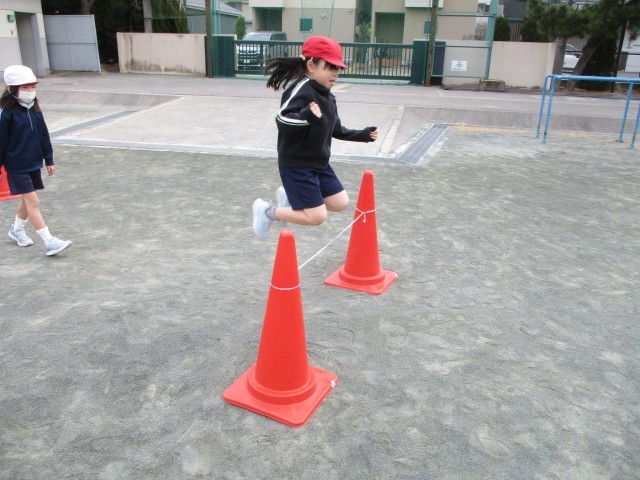 体育で「とびあそび」をしています。これからの幅跳びや高跳びにつながる大事な運動です。どうすると高く跳べるのか、遠くまで跳べるのかを考えてたくさん身体を動かすことができました。
