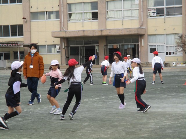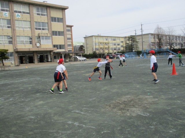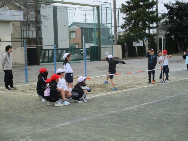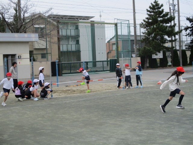 今日は暖かく過ごしやすい陽気となりました。運動場では2年生がとびあそびを行っていました。棒高跳びでは無事に飛び越すことができると、友達から賞賛の声が起き、跳んだ人もほっとした表情を見せていました。跳ぶ前の緊張感と跳び終えた後の達成感を楽しんでいるようでした。屋内運動場では、跳び箱運動を行っていました。跳び合えた後は両手をぴんと伸ばした姿勢で友達に終わりを知らせるなど、順番を守りながら何度も熱心に練習をしていました。4年生はタグラグビーを行っていました。ミニゲームの後は、振り返りを行い、ルールや技について確認をしていました。チームで声をかけあい、熱心に動いてボールをつないでいました。どの学級も楽しみながら熱心に取り組む姿が印象的でした。