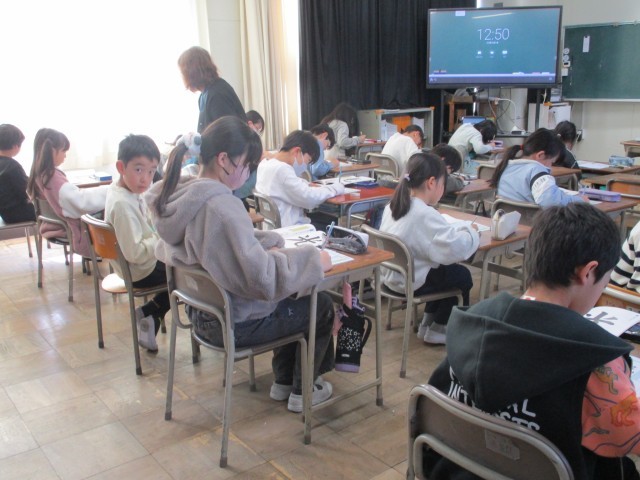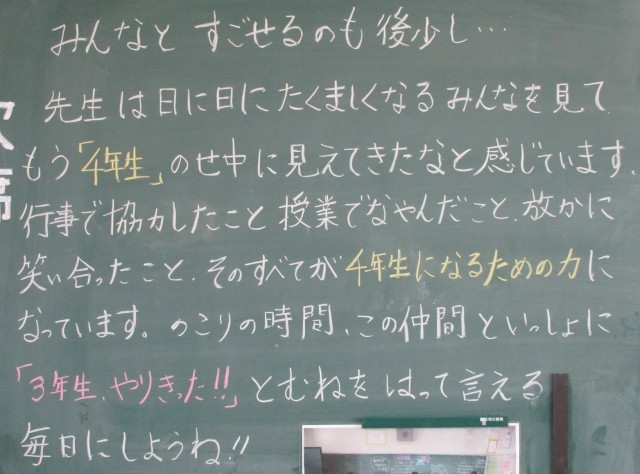3年生は今日も熱心に学習に取り組んでいます。話を聞く姿勢がしっかり身に付いている人がたくさんいて、感心しました。背面黒板の担任の言葉が子どもたちをやさしく包んでいます。3年生の生活も残りわずか。大切に過ごしていこうね。