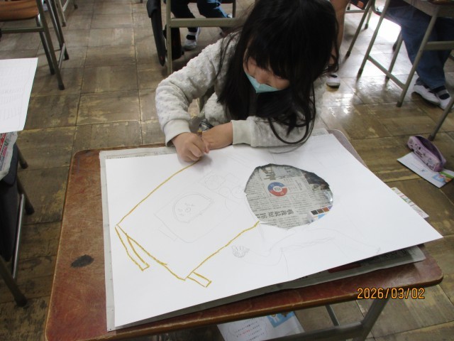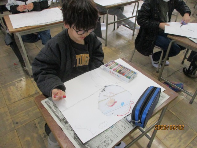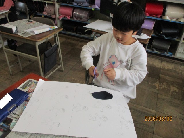 4組の図工の様子です。「顔を出したらなんだかワクワク」の学習では、顔が出せるパネルを制作しました。春に行った消防署見学、運動会、放課に友達と遊んでいる場面など3年生の思い出のワンシーンを画用紙いっぱいに表現しました。完成するのが楽しみですね。