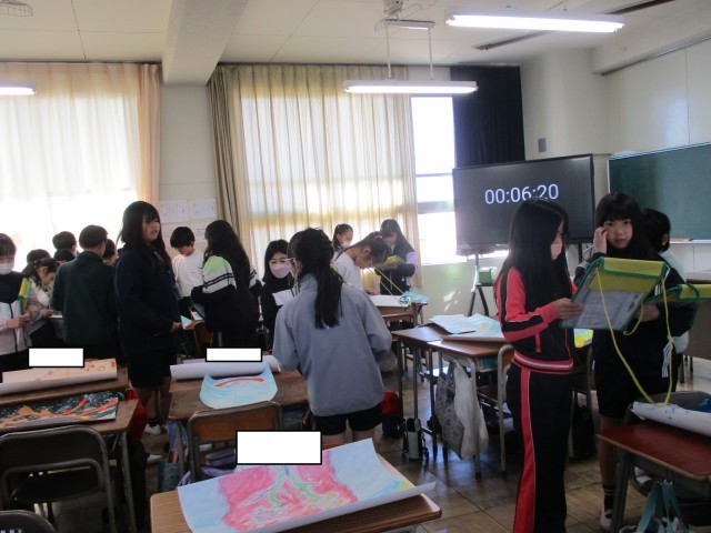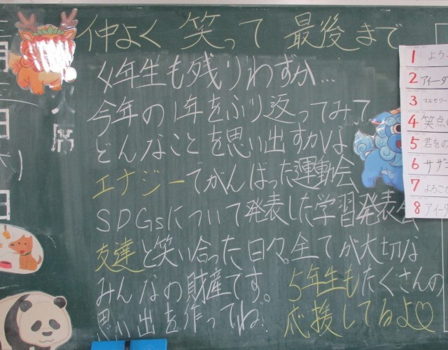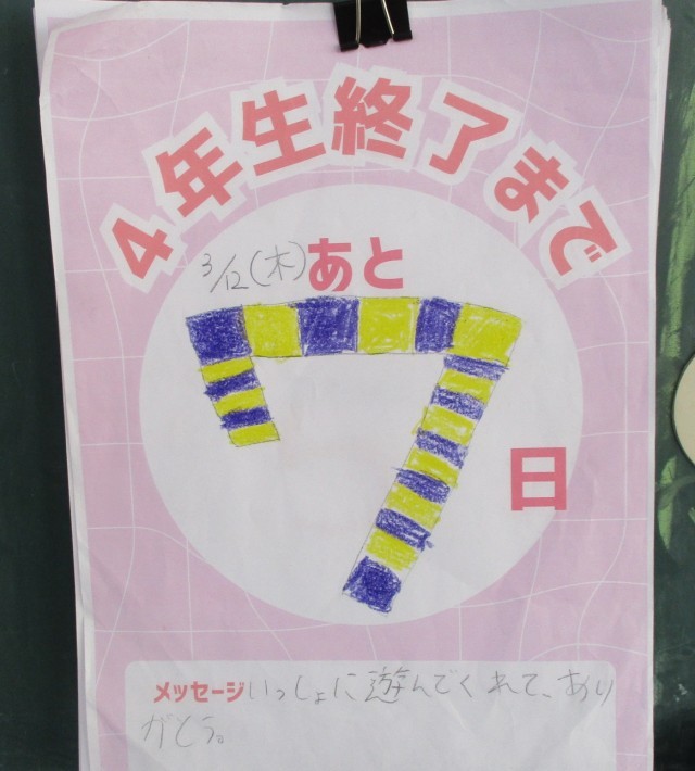 4年生の教室で過ごす時間もあとわずか。今日も熱心に学習に取り組む姿が見られました。社会では、名古屋港の歴史について学び、私たちの生活を支えている施設について理解を深めていました。教師と共に名古屋港の歴史についての資料を読み、画像を見ながら、理解を深めていました。図画工作では絵画の鑑賞を行っていました。友達の作品を見ながら、よさや工夫について記録をしていました。国語では自分が調べたことをスライドにまとめ、発表をしていました。友達からのアンケート結果をグラフ化して示すなどわかりやすい発表の工夫をしていました。教室の背面の手描きのカウントダウンカレンダーや教師の言葉が、子どもたちを静かに見守っているようでした。