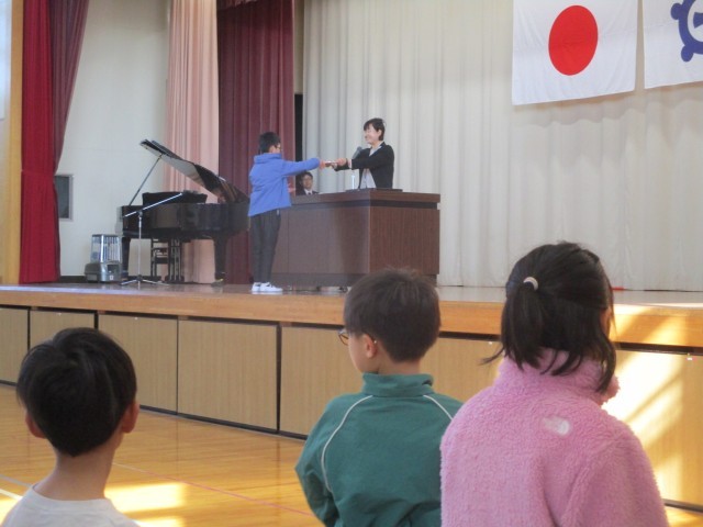 修了式で校長先生から終了証(あゆみ)を受け取りました。1年間勉強も、運動も、生活面も、みんなでなかよくすることも・・・いろいろなことをよく頑張りました。心も体も成長しました。そんな姿を近くで見守ることができ、担任一同嬉しく思っています。この1年間ご支援、ご協力ありがとうございました。