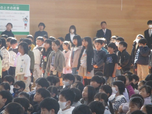 今日で1年生が終わりました。修了式では、きちんとした姿勢で話を聞く姿や、元気に校歌を歌う姿が見られました。初めてのことばかりの1年だったと思いますが、友達と一緒にいろいろなことに挑戦し、できることがたくさん増えました。2年生になったみなさんと4月に元気に会えることを楽しみにしています。保護者の皆様、1年間ご協力いただきありがとうございました。