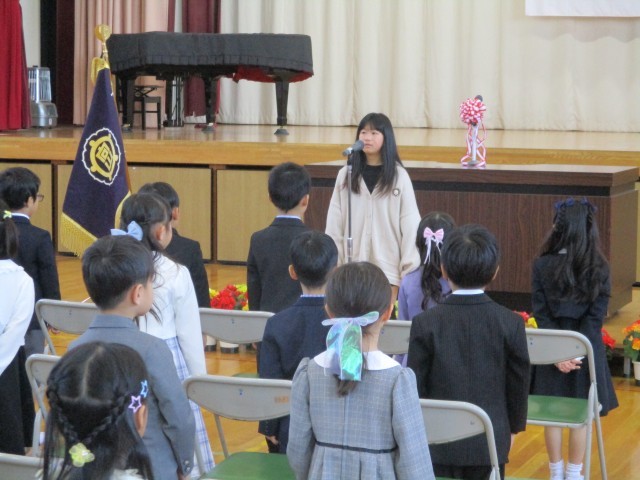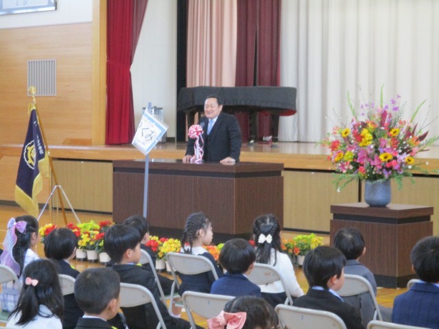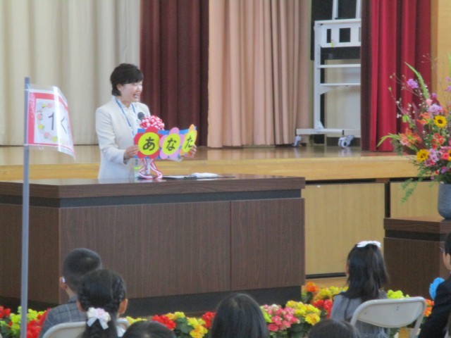キラキラ輝く99名の1年生の皆さんが、向山小学校に入学しました。PTA会長様、児童代表の6年生の人からのお祝いの言葉を、みんなしっかり聞くことができて、とても立派でした。みんな、向山小学校にとって大切な「あなた」です。「ありがとう」の言葉をたくさん言い「なかよく」「たのしんで」小学校生活をすごしてくださいね。