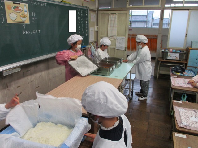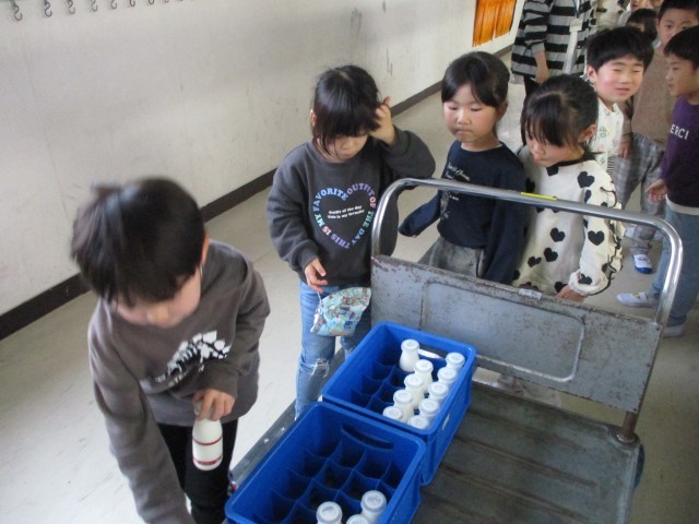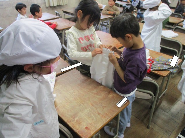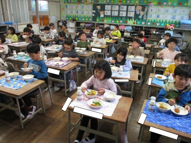 待ちに待った初めての給食です。手をしっかり洗ったら上手にエプロンに着替えて自分の当番を覚えました。困っているお友達に優しく教えてくれる姿もみられて先生は感動したよ。力を合わせてできたね☆配膳するのは2年生のお兄さんお姉さんがお手本を見せにきてくれました。いつかお兄さんお姉さんのようにできるようになる日が楽しみです。初めての給食のメニューはカレーでした。みんなで食べる給食はおいしいね。