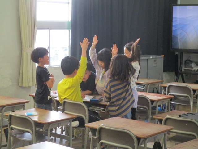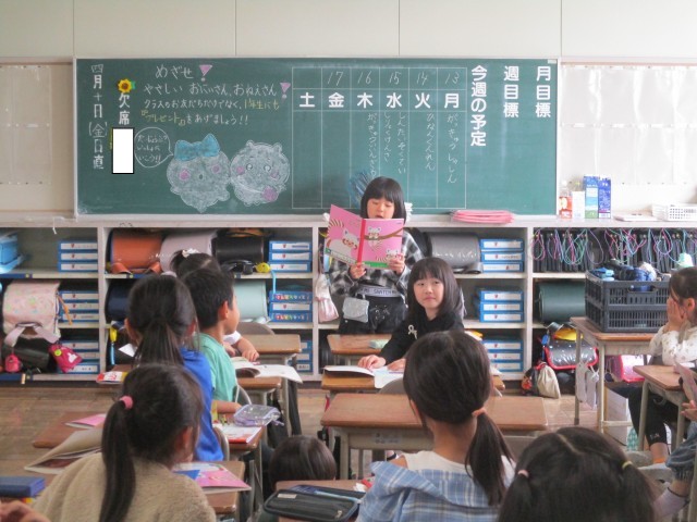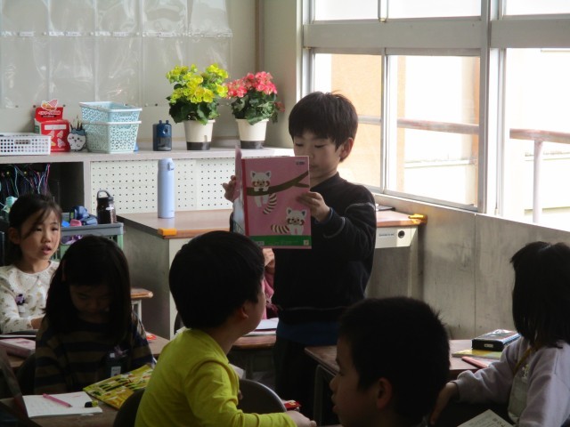 国語の授業では、教科書にある絵を見て、「どこで・どんな人が・どんなことをしているか」に注目して文章を書きました。その後、みんなの前で発表をしました。