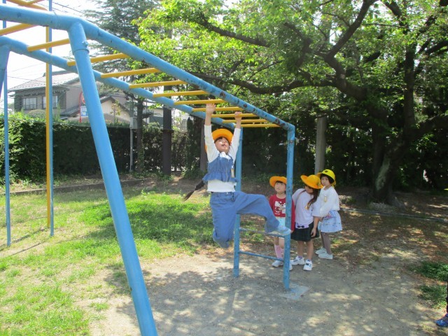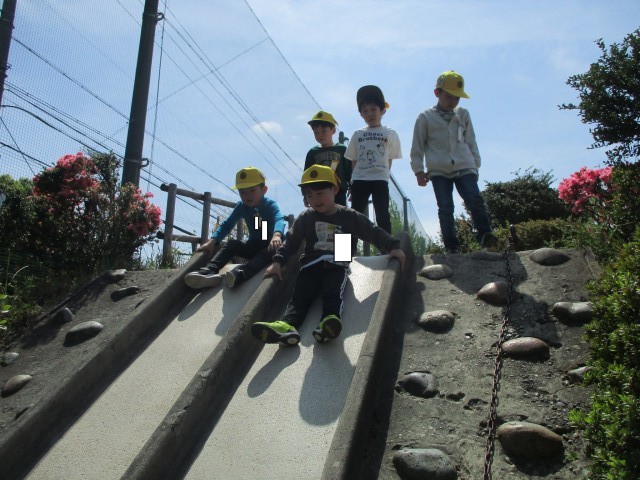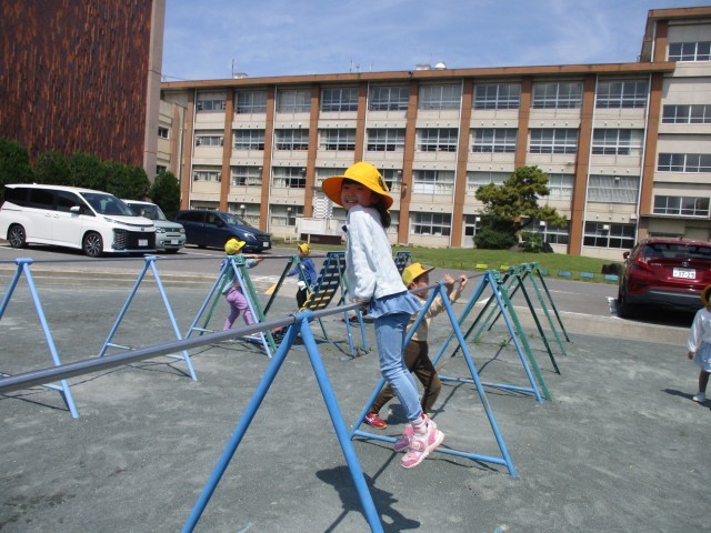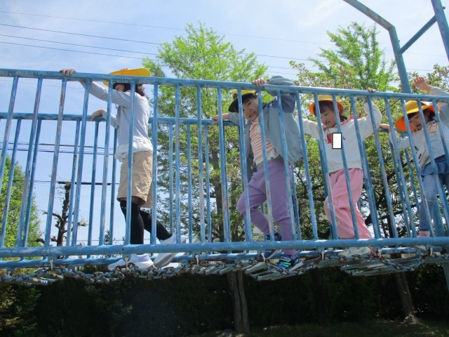 今日は初めての避難訓練がありました。地震が発生したら机の下で頭を隠して机の脚をおさえる。避難するときは「おさない はしらない しゃべらない もどらない」の約束を守って素早く非難することができました。避難訓練の後は遊具の使い方を覚えました。大きな遊具に子どもたちも楽しそうに遊んでいました。