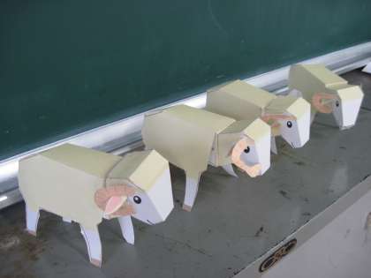 ペーパークラフトで羊を作りました。線にそって切り抜き組み立てました。のりではり合わせるところが難しかったです。かわいい羊ができました。
