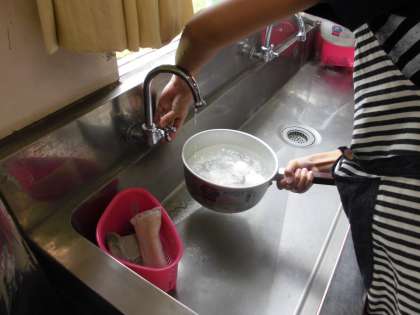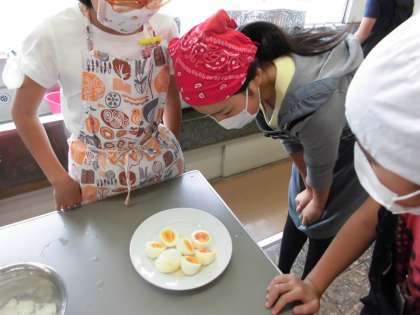 ガスこんろの使い方にも慣れてきた子どもたちです。今日は、ゆで卵に挑戦しました。卵の殻をよく洗い、沸騰してきたら時間を計ります。4個の卵を使い、3分後5分後10分後15分後でそれぞれ取り出し、殻をむきました。ゆで時間できみの固さが違うことを学習しました。