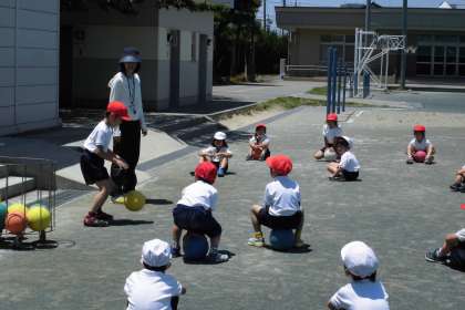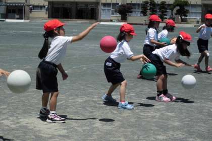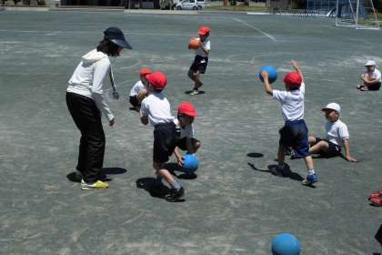 体育でボールを使って運動しました。両手でついたり、片手でついたりしました。様々な運動に、子どもたちは、意欲的に取り組みました。