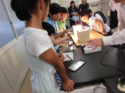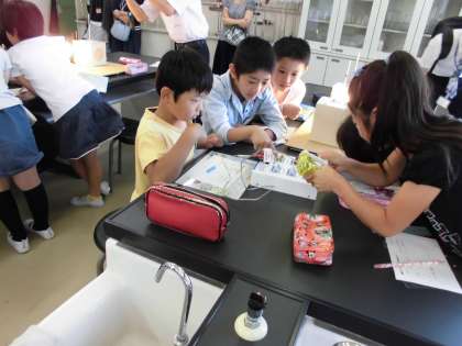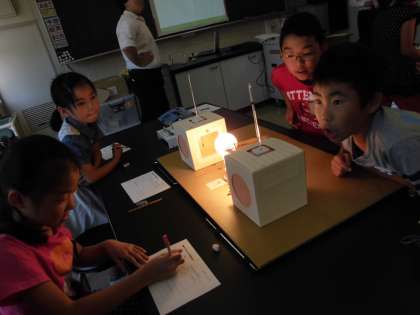 4年生は、市役所の環境保全課の方に来ていただき、クラスごとに「緑のカーテン講座」を受けました。普通の電球とLED電球の消費電力の違いを比べたり、緑のカーテンがあるとどれぐらい温度が下がるのかを調べたりしました。みんな、興味津々でお話に聞き入っていました。