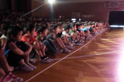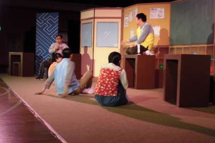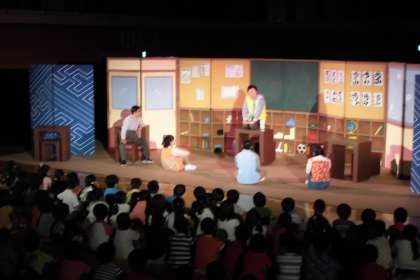 観劇会を行いました。今年は、劇団「うりんこ」の「夜明けの落語」を鑑賞しました。学校生活を舞台にしており、笑いあり、ドキドキのシーンありと、とても楽しい劇でした。2学期には、学芸会があります。子どもたちの演技のお手本となります。
