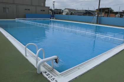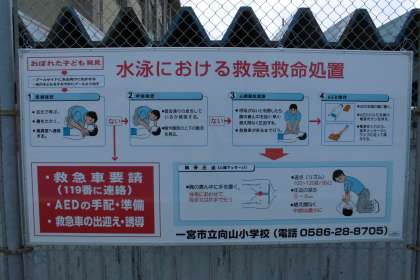 プールに水を入れ、ろ過機を回していつでも泳げるよう準備が完了しました。今年度、救急救命法の手順を示した看板を作り、設置しました。子どもたちが安全に、事故のないよう万全を期して指導に当たりたいと思います。