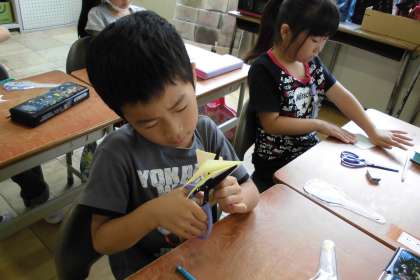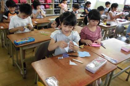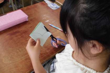 色紙を折って、模様をかいてはさみで切りました。どのような形ができるかは、開くまで分かりません。不思議な形ができ、子どもたちの歓声が上がっていました。