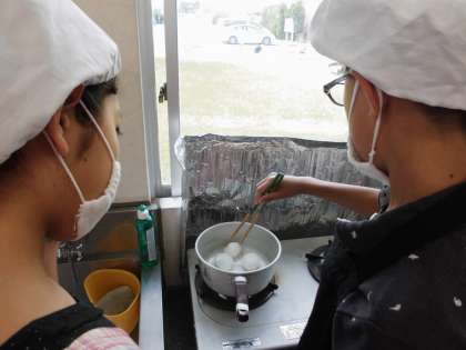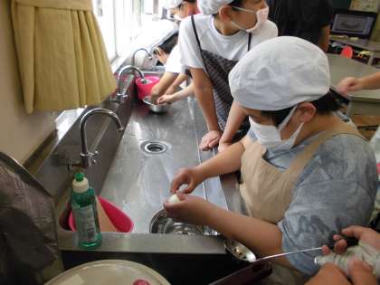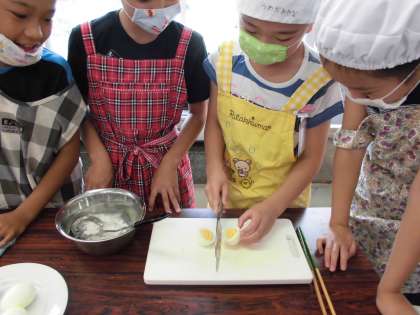 ゆで卵の黄身が真ん中にくるように、そっと卵を菜箸で転がしました。卵の殻も上手にむけました。包丁で切ってみると「わ〜っ」と歓声があがりました。「先生!黄身が真ん中にきているよ!」班員の心ひとつにゆで卵を作りました。上手にできましたね。