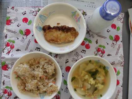 かき卵汁 白身魚の黒酢だれ ご飯 牛乳