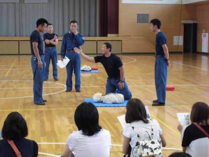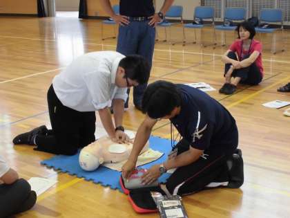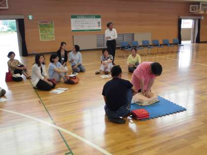 一宮市消防署より6名の署員の方を講師に迎え、「救急救命法講習会」を行いました。参加者は、PTA学級委員の方々と教職員合わせて48名で、いずれも子どもたちの水泳指導やプール解放の監視などに携わることになっています。子どもたちが、楽しく安全に活動できるよう、万が一に備えて、真剣に心肺蘇生法やAEDの扱い方を学びました。