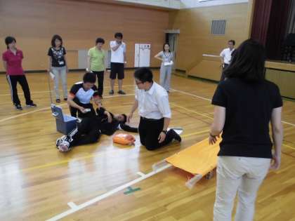 一宮市消防署の方を講師にお招きして、熱中症対応のシュミレーションを行いました。熱中症をおこした児童を救急車に乗せるまでの一連の流れを行った後、消防署の方にお話をうかがったり、職員同士で反省点を話し合ったりしました。