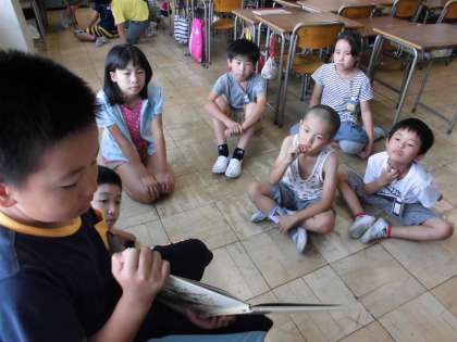 縦割り班活動による豊かな体験活動として、「なかよし読書」を行いました。縦割り班の高学年の児童たちが絵本を選び、低学年に読み聞かせをしました。低学年の児童たちは、目を輝かせて夢中になってお話を聞いていました。