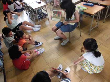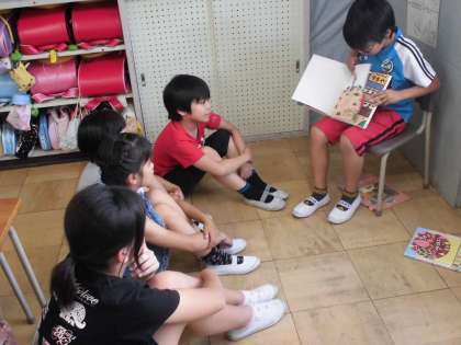 たてわり班のお兄さんお姉さんに、絵本を読んでもらいました。優しく上手な読み聞かせに、いつの間にかお話の世界へひきこまれていました。