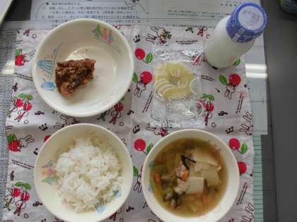 ワンタンスープ 鶏肉のから揚げ パイナップル ご飯 牛乳