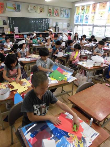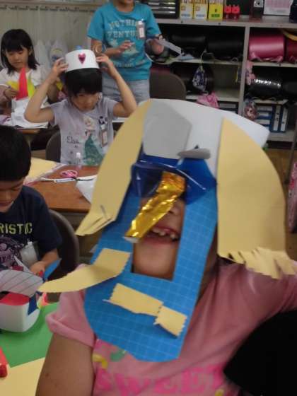 初めに輪っかを作り、頭にかぶりました。その後、その輪っかに思い思いの飾りをつけていきました。どの子も試行錯誤を繰り返しながら、自分の思いを形にしていきました。