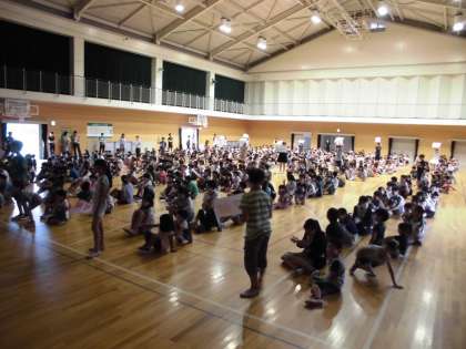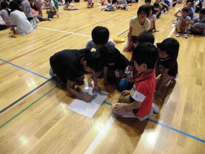 児童集会では、シャッフルクイズを行いました。スクリーンに映し出された問題に児童たちは楽しそうに答えることができました。とても楽しい会になりました。