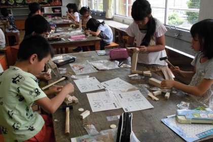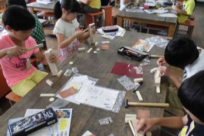 木材とくぎを使って動物を作りました。慣れない釘打ちですが、指を打たないように慎重に打ち付けていました。
