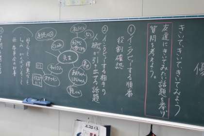 友達に聞いてみたい話題をあげて、質問を考えました。特に、インタビューする順番や役割確認をするとともに、インタビューする相手の人柄が引き出せるような話題にするよう指導しました。