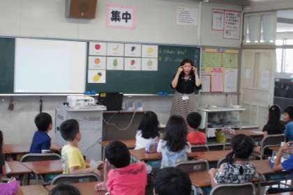 「これは何ですか」と聞かれたら、「それは、〜です」と答える学習をしました。メロンやミカンなど、果物で答えました。