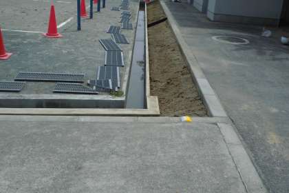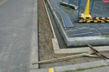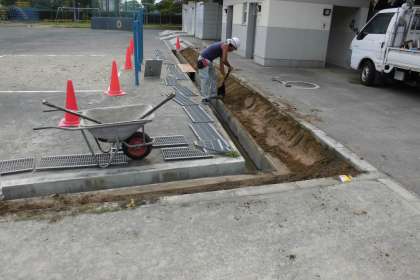 運動場周り(南側)ののり面の土の流出がひどく、段差ができていました。今日は、コンクリートで補修をしました。コンクリートが固まるまでは、立ち入らないようお願いします。