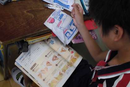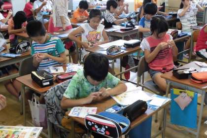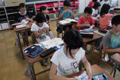 家庭科では、練習用の布に名前を縫い取る練習をしました。名前をどのように縫えば、読める文字になるのか考えながら進めました。また、玉どめや玉むすびなど、すでに学習したことも生かしながら仕上げました。