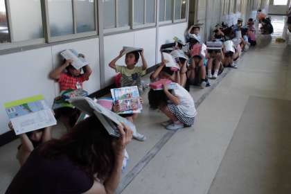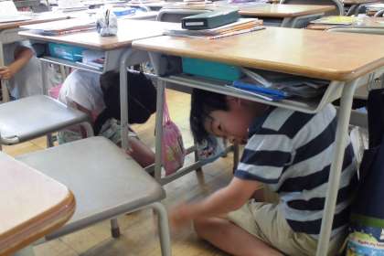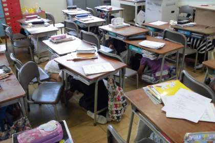 放課が終わった直後に、緊急地震速報が流れたことを想定して、「ミニ避難訓練」を行いました。毎月1回のミニ避難訓練も定着し、子どもたちは、冷静に避難姿勢が取れています。