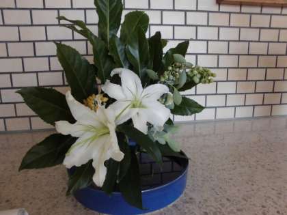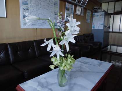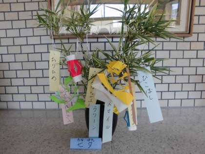 本校の職員玄関には「七夕」というタイトルの生け花を飾りました。笹には「スマイル」「クリーン」「みんななかよし」という短冊がつけられています。向山小学校のすべての児童たちの幸せを願い、活けました。その他にも清楚なイメージの白い花たちも、凛としたした姿で咲いています。暑い夏がやってきました。花たちからも元気をもらって生活していきましょう。