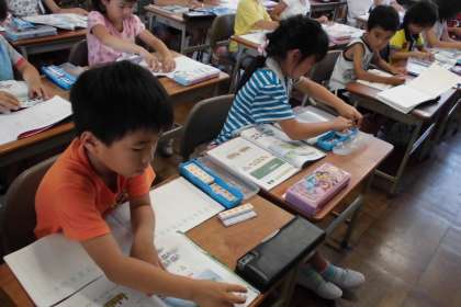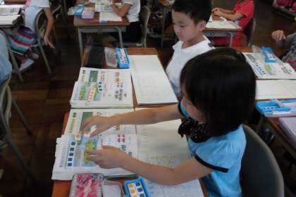 絵を見て、その数の違いを考えさせました。数図ブロックを置いて、違いを手で操作させて考えさせました。ひき算の概念を理解させていく基本となります。