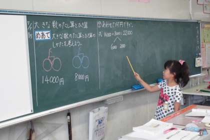大きな数の足し算の方法を理解させました。「14000+8000」のような計算では、1000がいくつあるか考えさせました。14000は、1000が14、8000は、1000が8。したがって、14+8=22。だから1000が22で22000となります。