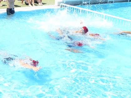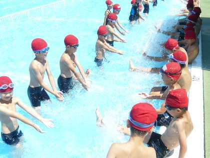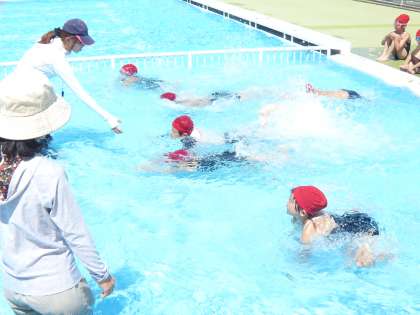 3つのグループに分かれて練習しました。少しずつ、水にも慣れて、伏し浮やバタ足などができるようになってきました。