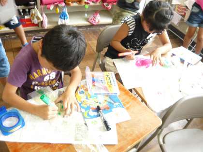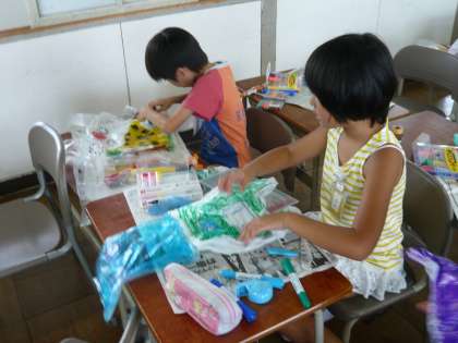 図工で、レジ袋などを使って「ふんわりふわふわ」という糸のない凧を作りました。風に乗ってふんわりふわふわ飛ばすおもちゃです。袋には、お気に入りの絵をかきました。