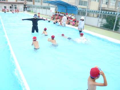 水泳の授業も終盤です。今日は、どの程度泳げるか、「水泳検定」を行いました。一人一人、担任についてもらって、泳いだ距離を教えてもらいました。