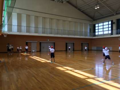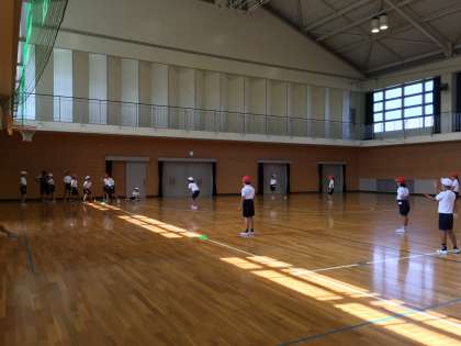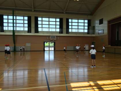 屋内運動場では4年生の児童たちが、ハンドベースボールのゲームをしていました。2つのグループに分かれて、元気に体を動かしていました。